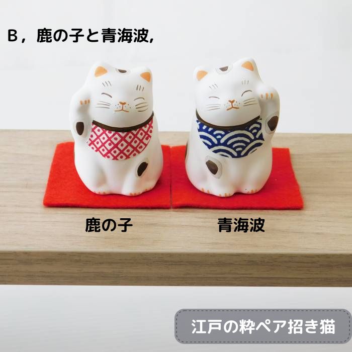 Bタイプ:鹿の子と青海波柄 子孫繁栄の鹿の子と平和な世を願う青海波 招き猫は左手をあげて人を招き、右手をあげて金を招くといわれています。