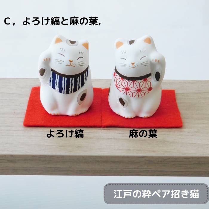 Cタイプ:よろけ縞と麻の葉柄 やや女性的な雰囲気を持つ幾何学模様と子の成長と魔除けになるといわれている麻の葉 招き猫は左手をあげて人を招き、右手をあげて金を招くといわれています。