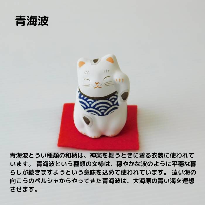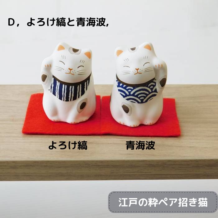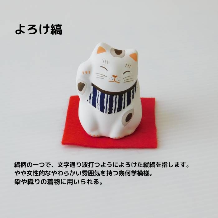 Dタイプ:よろけ縞と青海波柄 やや女性的な雰囲気を持つ幾何学模様のよろけ縞と世の平和を願う青海波 招き猫は左手をあげて人を招き、右手をあげて金を招くといわれています。