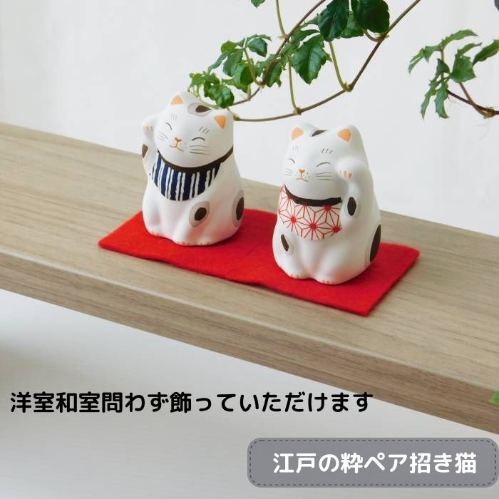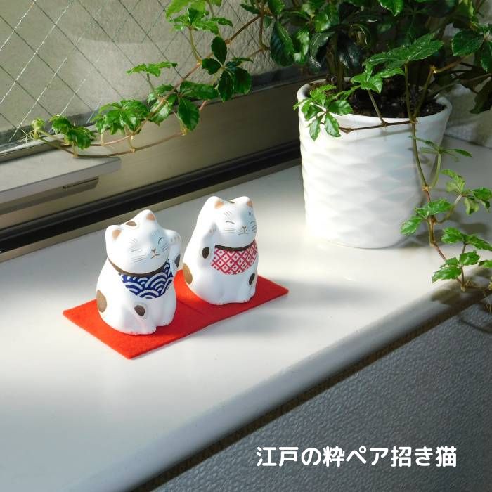 江戸の風情満載、手作りの猫置物。谷中堂製のペア招き猫は、福を招いて開運をもたらす幸せアイテムです。玄関やリビングに飾れば、おしゃれで運気もアップ!お祝いや贈り物にも最適。4種類のカラーバリエーションからお好みを選べます。日本らしい和のテイストを楽しむなら、この猫グッズは外せません。