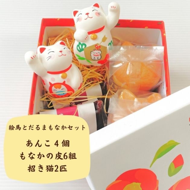 絵馬とだるまペア:2026年は午年、馬だるまと招き猫の絵馬のえんぎのよい招き猫ペア。運気上向き招き猫は上を向いて運を招きます、左手は人を招き右手はお金招き、しっかり幸せ招きます。招き猫ともなかセットは猫のもなかと北海道産小豆を使用したあんことの詰め合わせです。