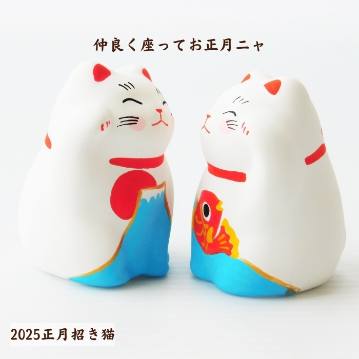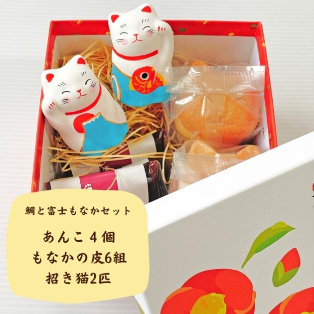 めで鯛と富士ペア:毎年人気のペア、縁起のよい招き猫で、左手は人を招き右手はお金招き、しっかり幸せ招きます。招き猫ともなかセットは猫のもなかと北海道産小豆を使用したあんことの詰め合わせです。